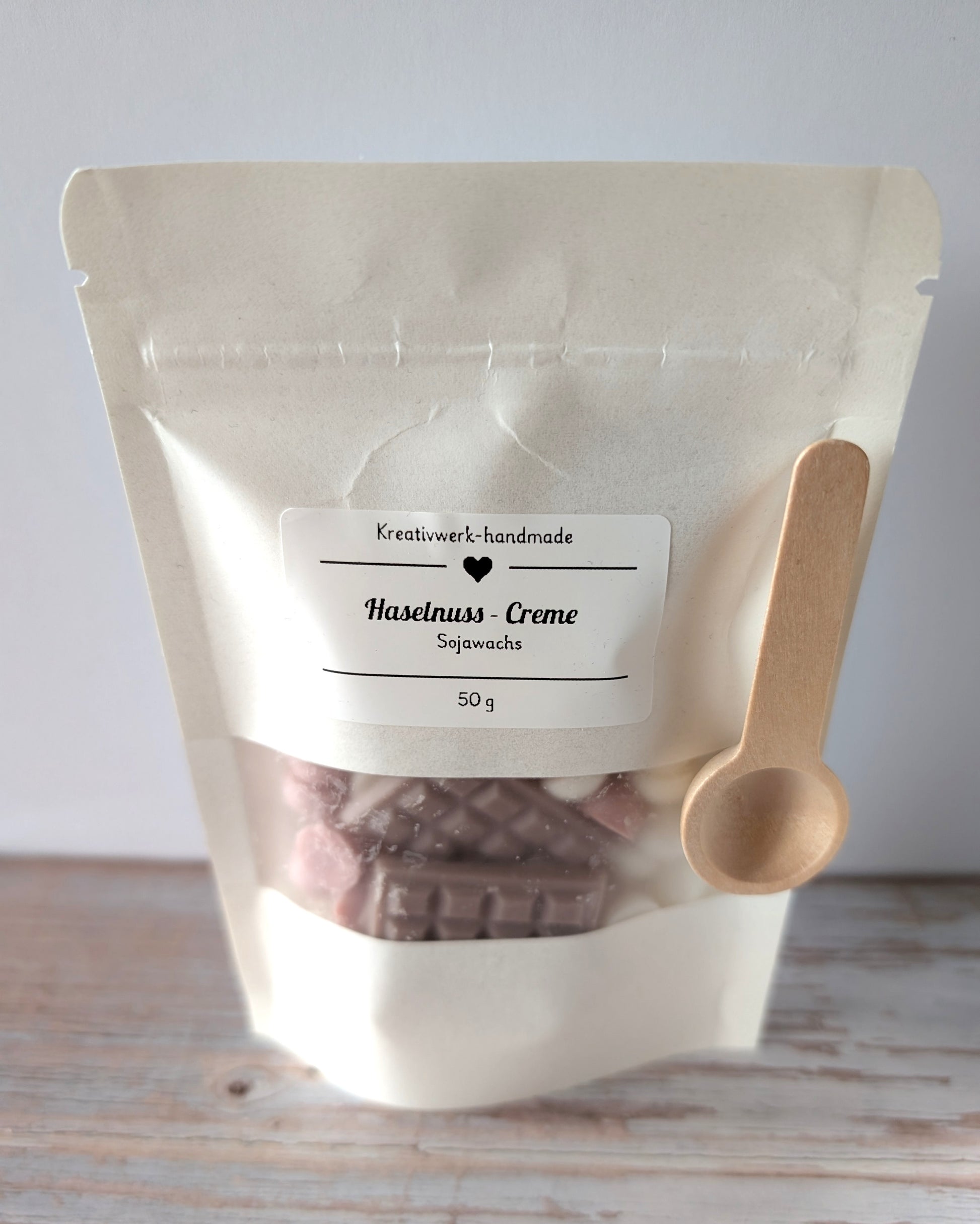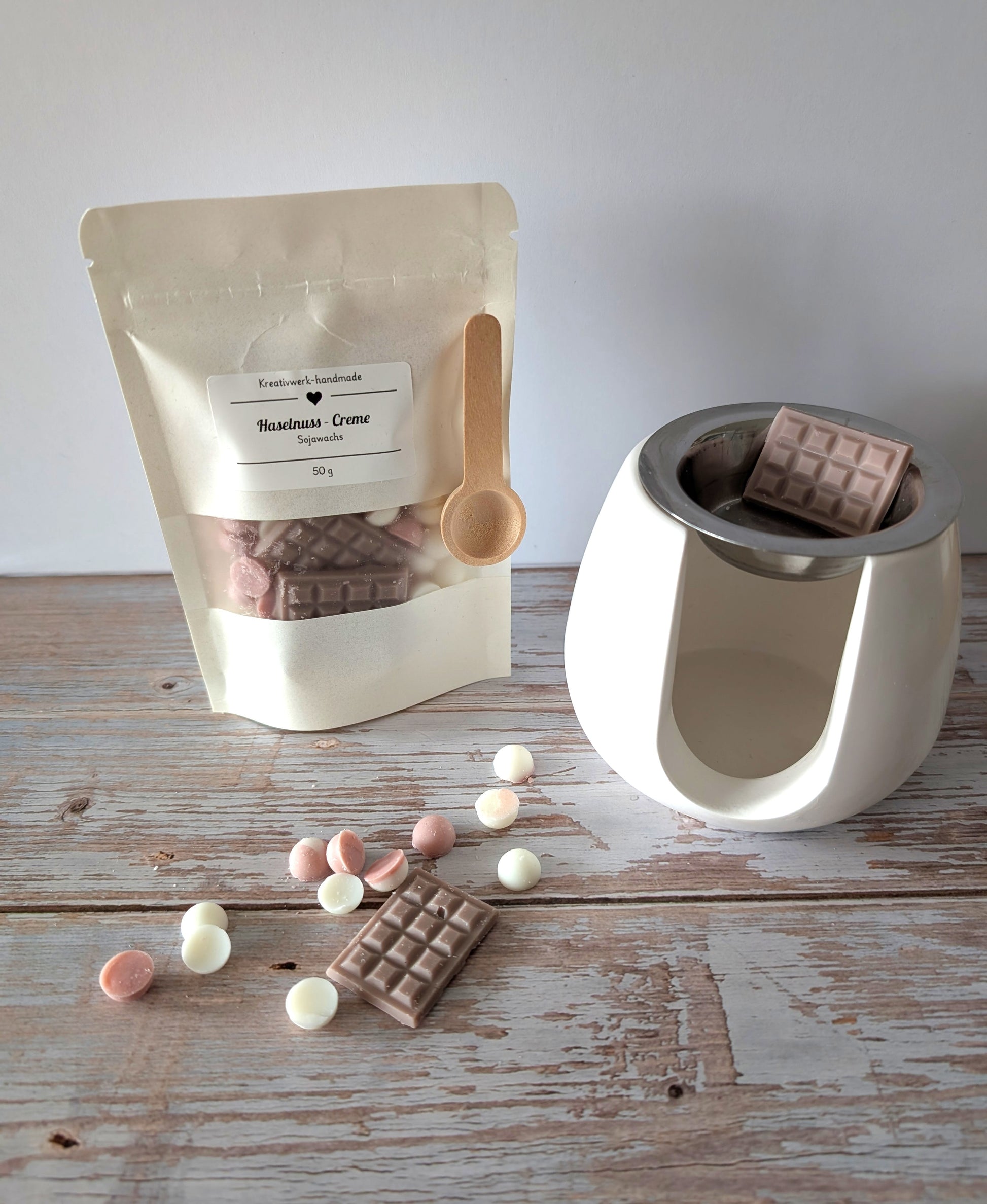 Meine Duftwachsperlen und die kleinen Schokoladentafeln verströmen den warmen, süßen Duft von Haselnusscreme.